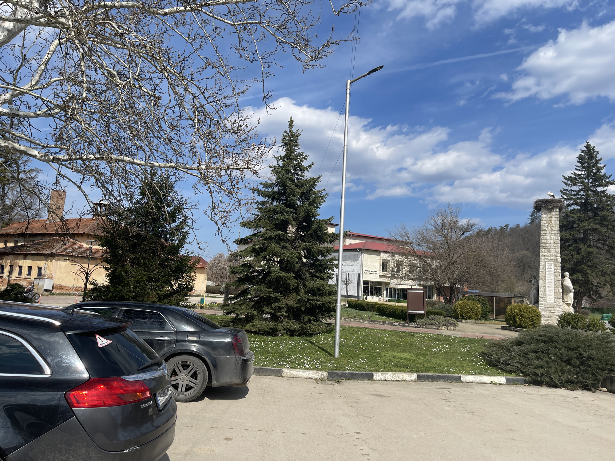 The image depicts a public area in Ugarchin, Bulgaria, under a bright, partially cloudy sky. In the immediate foreground, an asphalt parking surface occupies the lower section. Two vehicles are parked facing away from the viewer: a dark gray Opel Insignia Sports Tourer station wagon on the left, displaying a triangular "Kids on Board" sticker on its rear window and a Bulgarian license plate "CBxxxxKA", and behind it, a dark-colored Chrysler 300C sedan. Beyond the parking area, a landscaped green space features manicured grass dotted with white daisy-like flowers. A tall, silver-colored street light pole with a single luminaire stands centrally within this grassy expanse. Several evergreen trees, appearing to be conifers, are scattered throughout. To the right, a multi-tiered stone monument or obelisk, constructed of light-colored blocks, stands with at least two sculpted figures attached to its side and relief panels. A large stork's nest is perched atop this monument, containing a visible white stork. In the background, a modern building with a light-colored facade, a red roof, and large windows is visible, partially obscured by trees. Signs with Cyrillic text are present near its entrance. To the far left, an older building with a reddish-brown tiled roof and a prominent brick chimney is partially visible through the bare branches of a large deciduous tree. The distant background on the right shows tree-covered hills under the blue sky. No people are present in the scene.