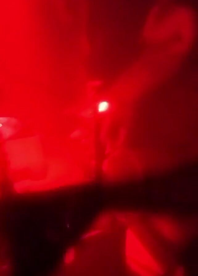 The video is shot in a room lit with red and blue lights, creating a club-like atmosphere. Two hookahs are visible on a table, along with what seems to be glasses or shot glasses arranged on a decorative tray. The video appears to have been taken in a dimly lit environment, possibly a party or lounge setting. The camera moves around, briefly showing lights in the background that are out of focus.