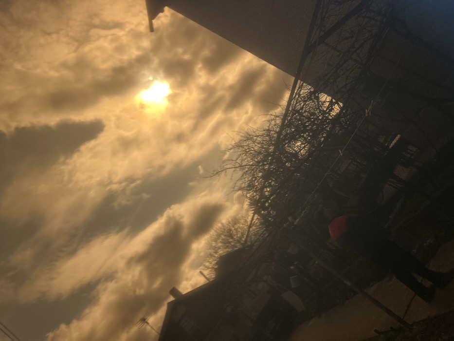 The image depicts an outdoor scene in Sofia, Bulgaria, characterized by an overhead view of a cloudy sky and shadowed ground-level elements. The sky, which occupies the upper half of the frame, is illuminated with warm, golden-orange tones from sunlight filtering through and around layered clouds. The sun is a bright, obscured light source in the upper right quadrant. The lower half of the image is significantly underexposed, presenting objects as dark silhouettes. In the upper left, a residential building's dark roofline, chimney, and a multi-pronged television antenna are visible. The right side of the frame features the vertical, shadowed wall of another building. The mid-ground contains dense, intricate patterns of bare, deciduous tree branches and what appears to be a dark, trellised or latticed structure, possibly a fence or pergola. A single human figure is present in the lower-left foreground, standing on a dark, indistinct path. The individual is largely silhouetted but exhibits a distinct red or orange patch on their upper back or shoulder area, suggesting a garment feature. Their posture indicates a static stance, with no discernible actions or interactions with other elements or individuals.