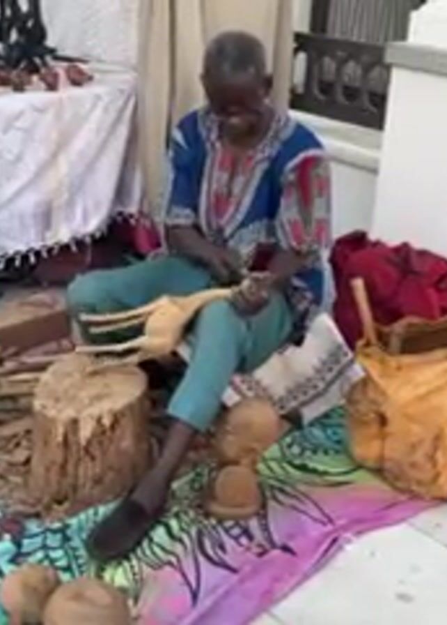 An elderly Black man is sitting cross-legged on a colorful blanket, carving a wooden animal figure. He is wearing glasses, a patterned blue shirt, and green pants. Around him are various wood carving tools, rough logs, and partially carved wooden figures. Behind him, a table displays finished wooden carvings. A bag is to his right, and a white pillar stands nearby. The scene is outdoors, on a paved surface.