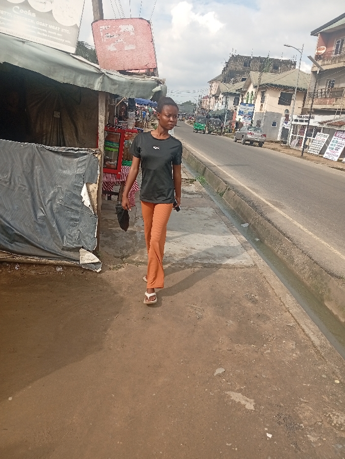 The image depicts an urban street scene in Aba, Abia State, Nigeria, under a partially cloudy sky. The primary subject is a young Black female, positioned slightly left of the frame's center, walking towards the viewer's right on a concrete sidewalk. She wears a dark grey short-sleeved t-shirt with a white logo and loose-fitting orange trousers, paired with white flip-flops. Her hair is pulled back, and she looks to her right. In her right hand, she carries a small black object, possibly a bag or wallet, while holding a dark-colored smartphone in her left hand. To the immediate left, a makeshift stall or shop structure is visible. It features a dark green tarp roof and a black tarp covering its side. Above the stall, a white sign with black text advertises "Cooks" and lists "SPAGHETTI, CHICKEN, GOAT MEAT ETC." and "CORNFLAKES, NOODLES, BEANS..." along with "WHOLESALE RETAIL". A faded, square-shaped red sign is affixed to a pole directly above the stall, facing the street. Inside the stall, a red-framed display case containing various items is partially visible. The sidewalk, made of concrete, appears uneven and worn, with some debris present. A concrete curb separates the sidewalk from a wide asphalt road, which features a narrow drainage ditch alongside the curb. In the mid-ground, on the road, two green and yellow tricycles (Keke Napep) are visible, along with a light-colored sedan moving away from the camera. The background reveals a row of multi-story buildings lining the right side of the street. These structures exhibit varying architectural styles and conditions, some with ground-floor businesses indicated by signs such as "TEOLIN CLOTHING" and "BINGOO". Utility poles and streetlights are also visible along the thoroughfare.