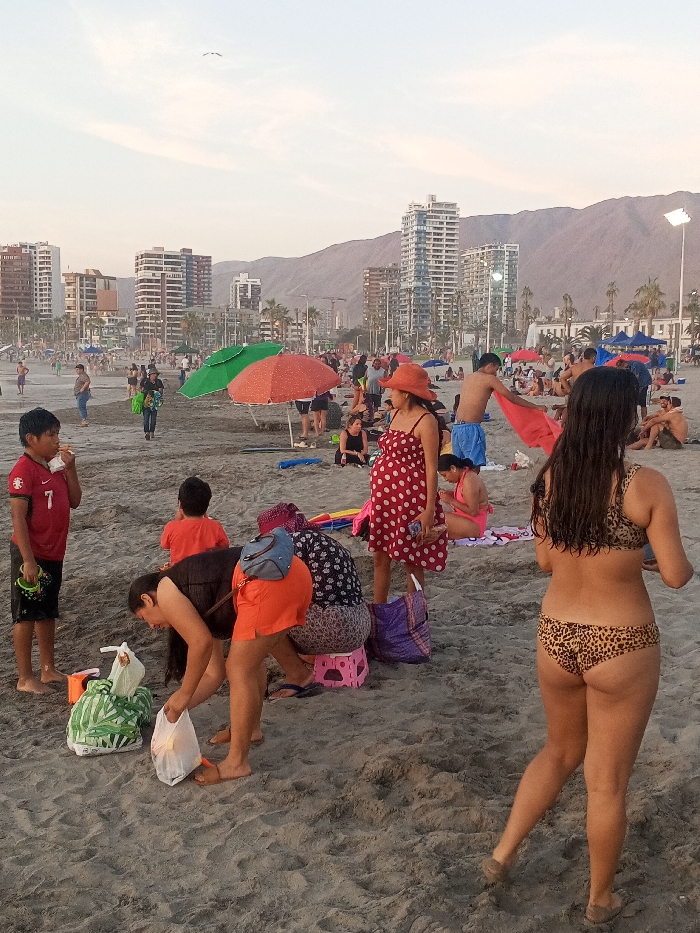 A beach scene shows a crowd of people enjoying the day. In the foreground, a woman in a leopard-print bikini walks away from the viewer. Several people are gathered nearby, including a boy in a red jersey, and some unpacking bags. Further back, sunbathers relax under umbrellas, with tall buildings and a mountain range visible in the distance. The sky is pale and hazy.