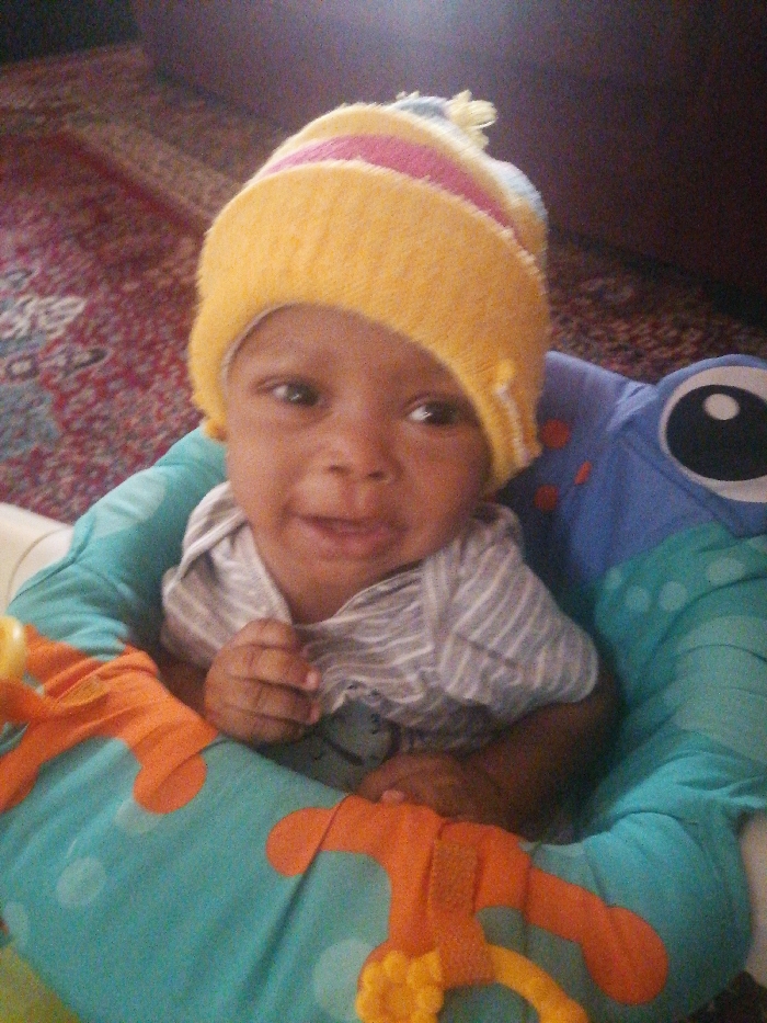 - "A baby wearing a yellow and pink knit hat sits in a teal and blue baby seat with orange plush attachments" by FM-h26DA2, licensed under CC BY 4.0