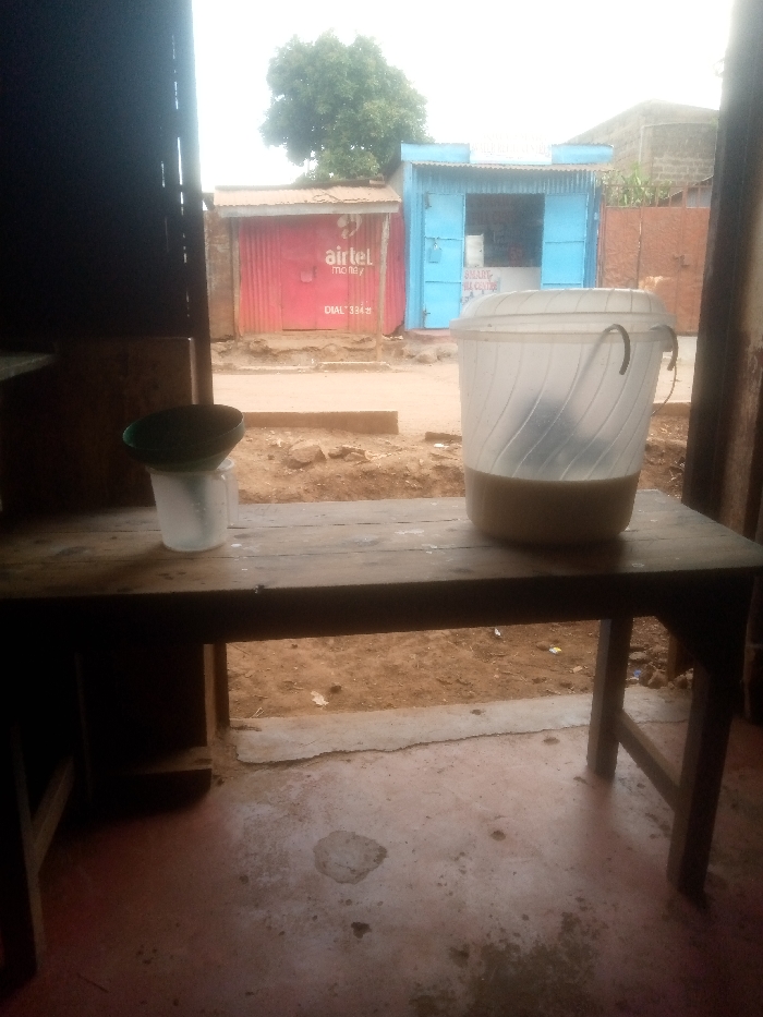 A worn wooden table sits inside a building, holding a plastic bucket filled with light-colored liquid and a measuring cup topped with a green funnel. Outside, visible through a doorway, stands a red Airtel money booth and a blue shop under a tree. The ground outside appears to be dirt. The building interior has a simple concrete floor. The table's rustic appearance suggests a basic or rural setting.