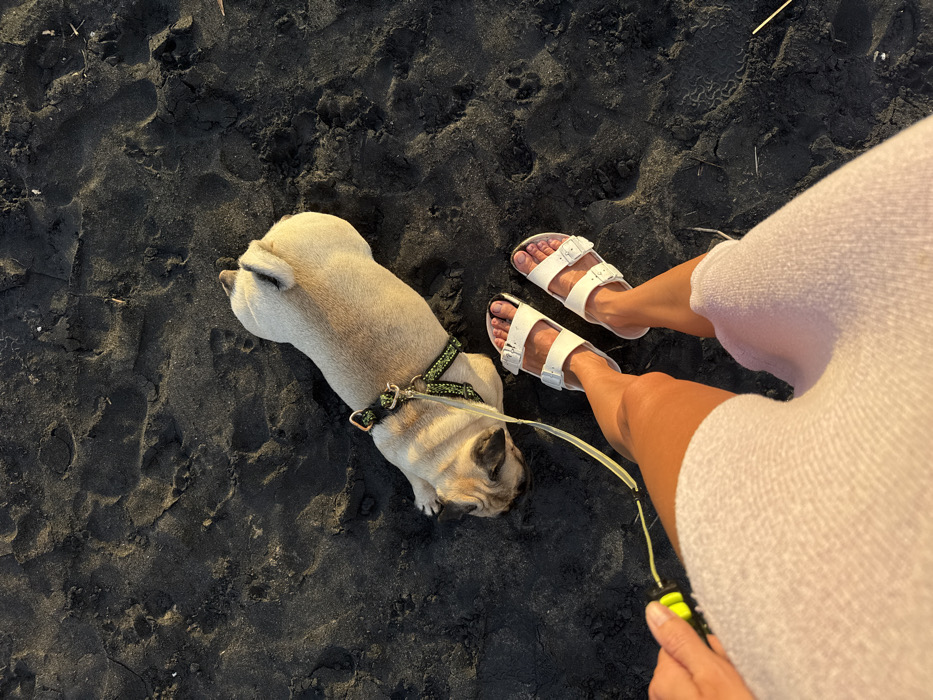 The image displays a top-down perspective of a person and a dog on a black sand beach in Canggu, Indonesia. The lower body of a person is visible, wearing a light-colored, possibly off-white or pink, knitted garment and white two-strap sandals. The person's left hand holds a neon yellow-green retractable dog leash. To the left of the person's feet, a fawn-colored pug lies flat on the black sand, facing left with its head resting down. The pug wears a green harness with sparkling embellishments. The black sand beneath them is textured with various indentations and ripples. A small, light-colored twig or piece of straw is visible on the sand in the lower right corner. The scene is illuminated by natural light, casting subtle shadows and highlighting the sand's texture.