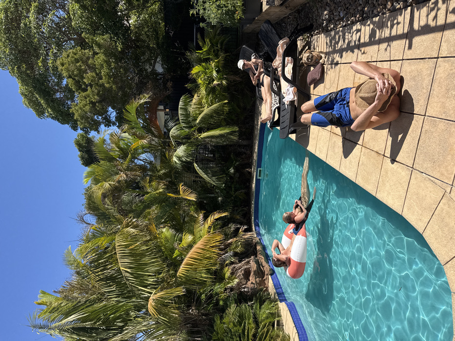 A sun-drenched scene features people enjoying a pool. One person in the water is floating in an inflatable ring. Two individuals are sunbathing on lounge chairs beside the pool. Another person is relaxing on the pool deck, shielding their face with a hat. Lush tropical vegetation surrounds the pool area, creating a relaxing, vacation-like atmosphere under a clear blue sky.