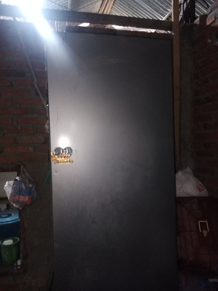 A tall, gray refrigerator stands in what appears to be a cluttered and dimly lit room. The walls are brick, and the ceiling is a mix of wood beams and corrugated metal. Various items are visible around the refrigerator, including a plastic container, a trash bag, and a wicker basket. A golden emblem is attached near the top-left of the fridge. The overall impression is that of a lived-in, possibly rural, space.