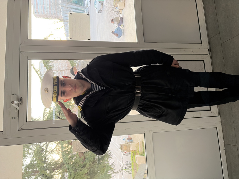 - "A young male, appearing to be in his late teens or early twenties, stands indoors, centered in the frame, performing a salute with his right hand to the brim of his white sailor cap" by FM-iCkYo2, licensed under CC BY 4.0