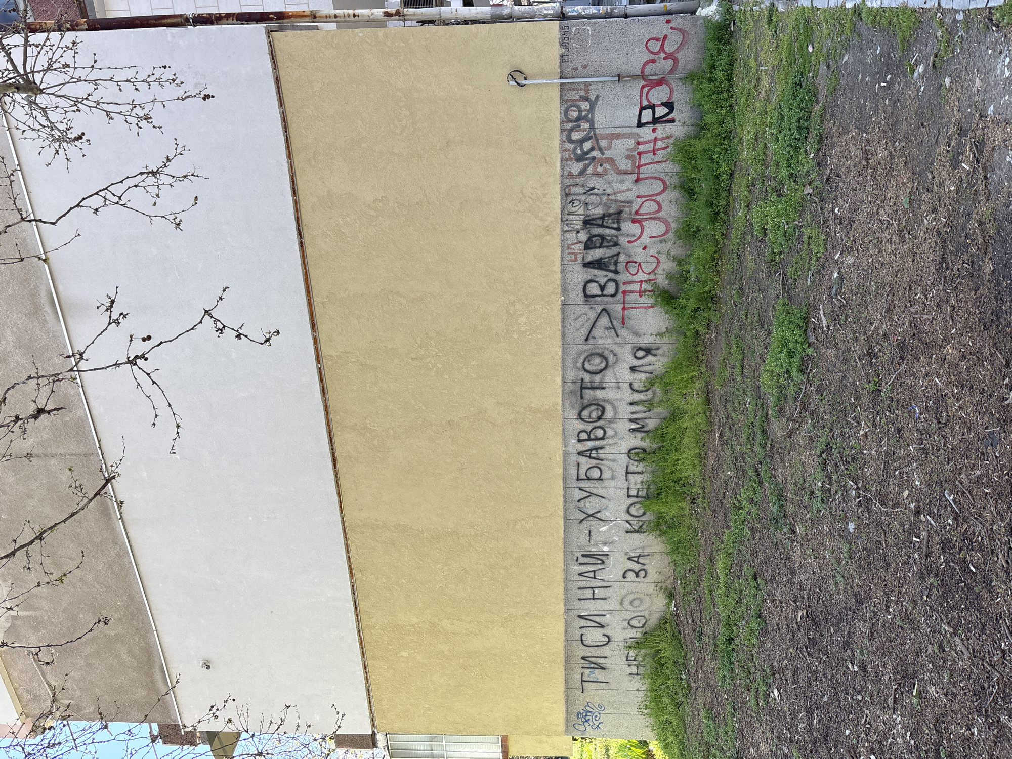 A daytime, eye-level shot depicts a building facade adjacent to overgrown vegetation and soil. The building's exterior features three distinct sections with varying textures and colors: gray-beige, white, and light yellow. Graffiti is visible on the rightmost section of the facade, where the light-yellow section meets a gray concrete strip. The graffiti is a mix of script and tags in Bulgarian and English, including the phrases "ТИСИ НАЙ-ХУБАВОТО" (You are the most beautiful), "THE YOUTH ROCKS," and some illegible tags. A bare tree branch extends into the frame on the left, partially obscuring the building. The vegetation along the base of the building is dense and green, while the remaining ground cover consists of soil, weeds, and small debris.