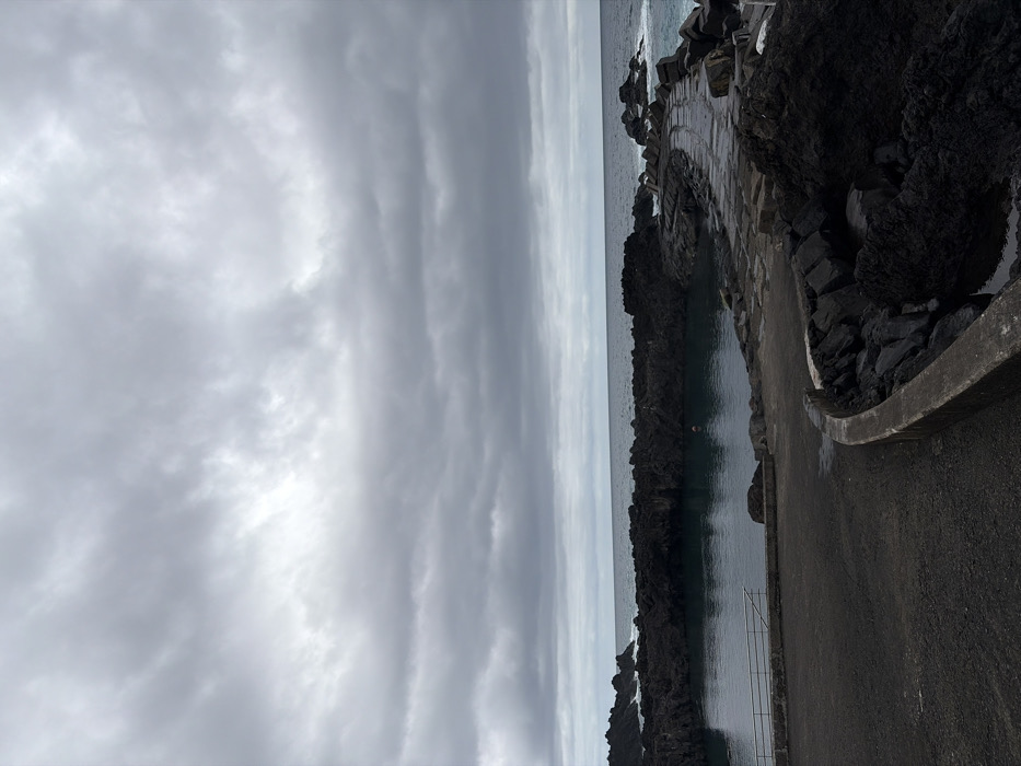 The image displays the natural volcanic pools in Porto Moniz, Portugal, under an overcast sky. The upper half of the frame is filled with a uniform layer of dense, grey clouds. A distinct horizon line separates the sky from the Atlantic Ocean, which presents a dark blue-grey color, with some wave activity and whitecaps visible on the water and impacting the distant rock formations on the right. In the midground, dark, rugged volcanic rock formations delineate several natural pools of water. The prominent pool on the left side of the image contains calm, dark-toned water, with a silver-colored metal handrail extending into it from the left edge. A small, spherical red buoy floats in the mid-right section of this pool. A curving, paved walkway constructed from dark, irregular stone blocks or concrete sections emerges from the lower-right foreground, following the contours of the rock formations and extending into the ocean on the right, serving as both a pathway and a breakwater. This walkway appears wet. Adjacent to the walkway on the right are additional dark volcanic rock formations and concrete blocks. The lower-left foreground consists of a dark, paved surface, bordered by a low, light-grey concrete curb separating it from the pool area. No individuals or specific activities are visible within the scene.