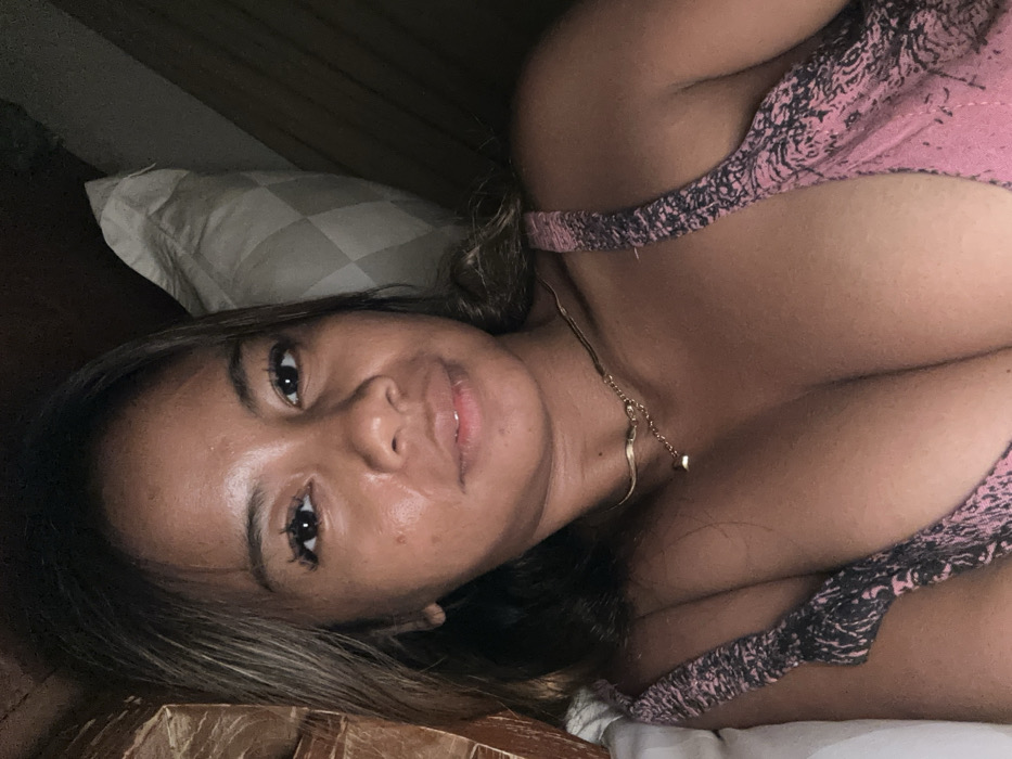 A woman lies on her side in bed, gazing at the camera. Her top is pink with a dark pattern. She wears a gold necklace with a horn-shaped pendant. A pillow with a light grid pattern is behind her head. The lighting is dim, casting shadows on her face and the bedding.