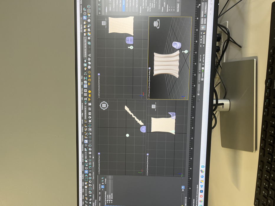The image displays a computer screen running 3ds Max software. The interface is divided into four viewports, each showing different perspectives of a 3D scene. The scene appears to contain various objects, including curved surfaces resembling fabric or sheets, a circular object, and other simple geometric shapes. The viewport labels suggest "Front," "Perspective," "Top," and "Left" views. The toolbar on the left offers tools for modeling, rendering, animation, and other functions. The overall scene looks like a 3D modeling project in progress.