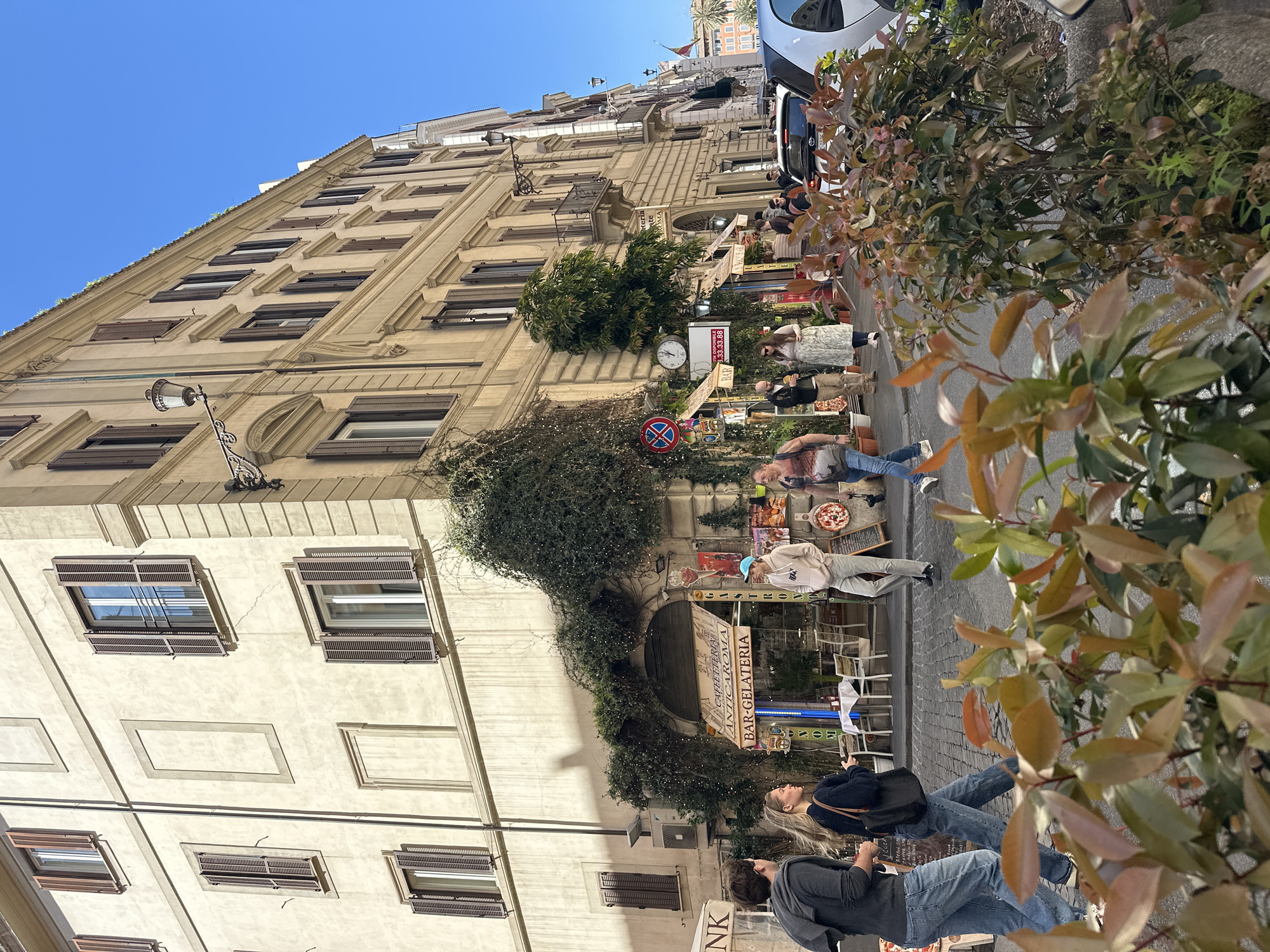 This image depicts a sunlit street scene in Rome, Italy, specifically at the corner of Via dei Pastini. The prominent structure is a multi-story, light-beige stucco building with ornate architectural details and numerous windows fitted with dark brown wooden shutters, many partially open. The ground floor corner houses the "Caffetteria Bar-Gelateria Anticaroma," identifiable by its awning and signage. The cafe entrance is arched and heavily draped with green ivy or climbing plants, interspersed with small decorative lights. Outdoor white tables and chairs are set up on the cobblestone sidewalk in front of the establishment. On the left, a man in a dark gray hooded top and blue jeans walks from right to left, accompanied by a woman with long blonde hair, wearing a dark top, blue jeans, and carrying a black shoulder bag, also walking right to left. Another man in a light sweatshirt and a light blue cap stands near the cafe entrance, facing generally forward. Further right, a woman in a light patterned dress walks towards the left. Additional individuals are visible further down the street, including a man in a light shirt on the far right. The street is paved with cobblestones. A red circular "Do Not Enter" sign is visible on the building facade near the cafe entrance, alongside a round white wall clock displaying approximately 6:50. Decorative streetlights are mounted on the building. Parked cars, including a white vehicle, are visible further down the street on the right. The foreground features planters with reddish-green foliage, slightly blurring the lower portion of the image. The sky above is clear blue, indicating bright daylight.