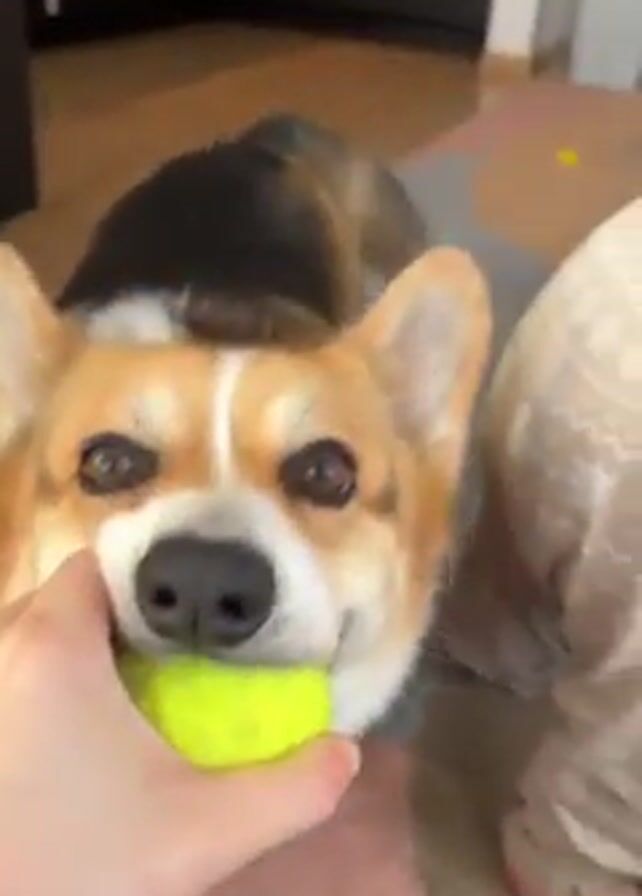 A close-up shot shows a corgi dog with a tennis ball in its mouth