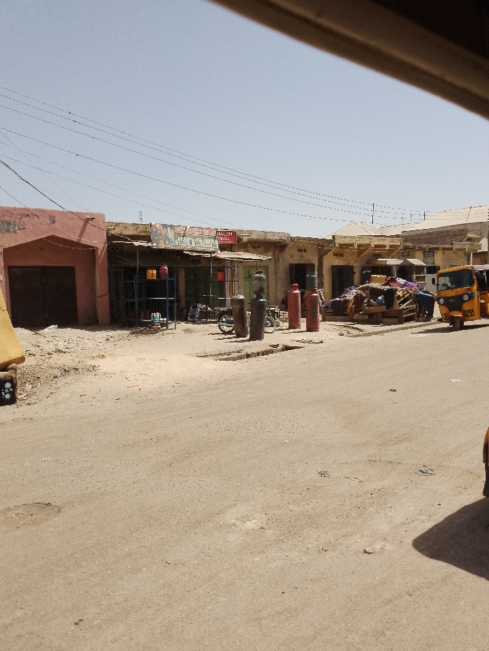 The scene depicts an outdoor commercial street in Sabon Gari West, Nigeria, under a clear, bright blue sky