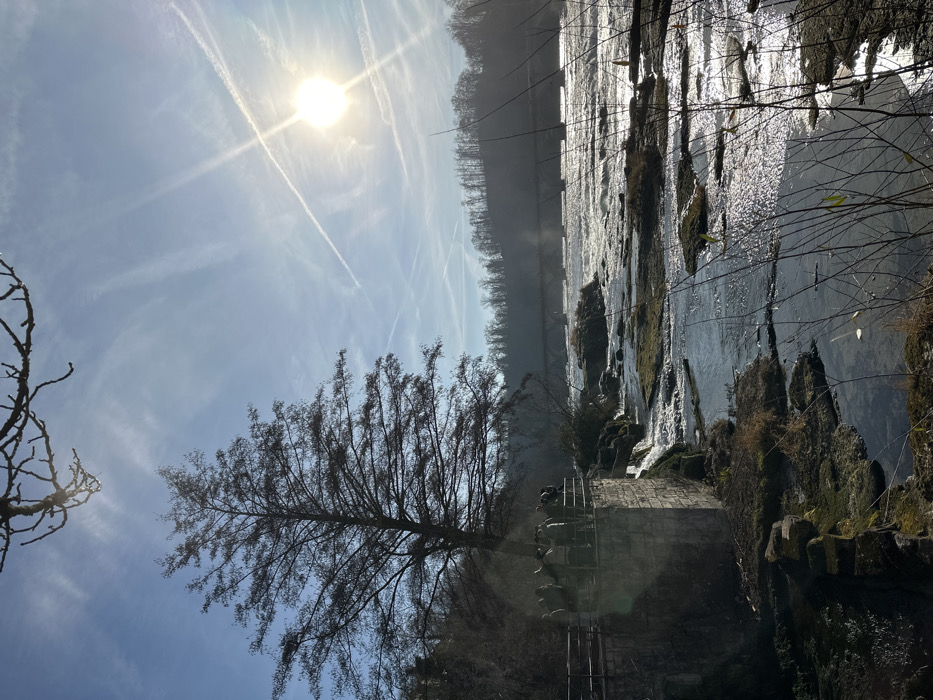 This image depicts a segment of the Rhine River in Neuhausen am Rheinfall, Switzerland, under clear, sunny daytime conditions. In the foreground-left, a multi-tiered stone viewing platform with a dark metal railing is populated by approximately ten individuals, silhouetted, observing the river. One individual on the platform has an arm raised. A large deciduous tree, largely bare, stands immediately to the left of the platform, extending into the upper left frame. The midground features the fast-flowing Rhine River, characterized by numerous rapids and exposed dark rocky outcrops. Sunlight reflects brightly off the water surface, creating significant glare. In the background, a multi-arched bridge spans the river, connecting densely forested banks of bare trees. A visible mist or fog hovers above the river near the bridge. The sky is clear blue with several prominent white contrails; a brilliant sun is positioned in the upper right, generating a strong lens flare.