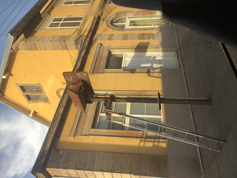 The image depicts a bright yellow, two-story building under a blue sky with some clouds, located in Hochfelden, France. The building features light-colored stone quoins at its corners and around window and door frames. On the upper floor of the gable end, there are two square windows with patterned glass. The main facade, bathed in sunlight from the right, includes a rectangular window with blinds visible behind a metallic pole structure, a white double door, and an arched glass door with a white frame. Two windows with closed white louvred shutters are visible on the upper floor to the right. A dark blue sign with white lettering, partially obscured on the right, reads "HOCHF..." In the foreground, an aluminum extension ladder leans against a dark metallic vertical pole structure. The pole is topped with a rectangular, rust-colored metal box, possibly a dismantled fixture, and has a lower horizontal support bracket. The ladder extends from the paved ground, which appears to be asphalt, upwards towards the pole structure and the building's first-floor window. Strong, low-angle sunlight casts long shadows of the ladder and pole structure onto the building's facade and the paved ground. No individuals are present in the scene.