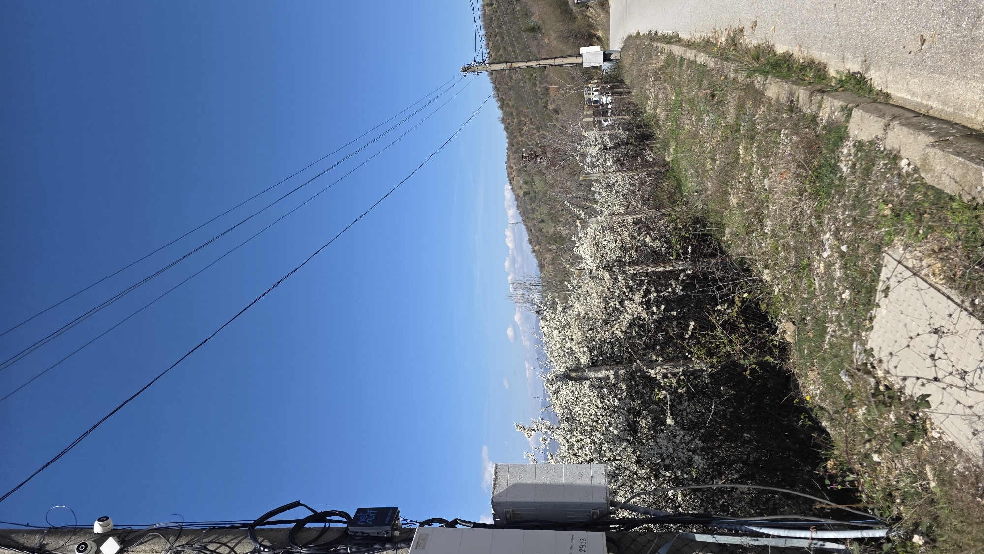 The scene is an outdoor shot in Marulevo, Bulgaria. The sky is clear blue, with utility lines stretching across the upper left quadrant. A road runs along the upper right edge of the image. A grassy slope descends from the road, merging with a dense row of trees that are in full bloom with white flowers. Below the trees, and in the lower part of the image, is a concrete structure with various technological devices, including cables, surveillance cameras, and boxes. Numbers and text, such as "2903," are visible on the boxes. The foliage appears to be dense and overgrown, and a chain-link fence runs alongside the trees.