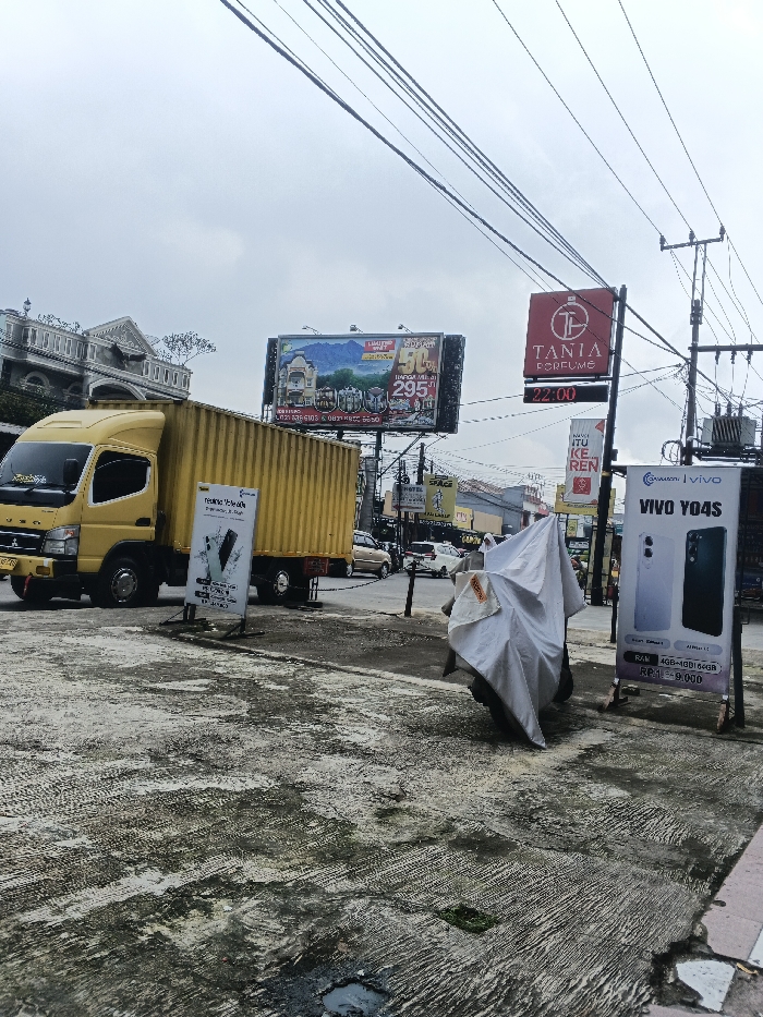 This image depicts a commercial street scene in Sariaya, Philippines, under an overcast sky. In the foreground, a textured concrete surface with various stains and a small puddle occupies the lower portion. Two A-frame advertising signs stand on the right: one prominently displays a "VIVO Y04S" smartphone, detailing its specifications and a price in Rupiah, while the other advertises a "realme C51" smartphone. A motorcycle, entirely concealed by a light-colored tarp with a small orange tag, is positioned between these signs. In the midground, a yellow Fuso box truck is parked on the left side of the street, facing left. Behind it, a multi-story building featuring ornate, light-colored architecture is partially visible. A large billboard in the center-left advertises real estate with images of buildings and pricing. To the right, a utility pole supports multiple overhead power lines and a grey electrical transformer. Attached to this pole is a red vertical sign for "TANIA PERFUME" with a digital clock displaying "22:00" below its logo. Several other vehicles, including cars, are visible on the road further in the background, suggesting ongoing traffic. The background consists of additional commercial buildings lining the street. No discernible individuals are present in the immediate foreground, and no direct human actions or interactions are depicted.