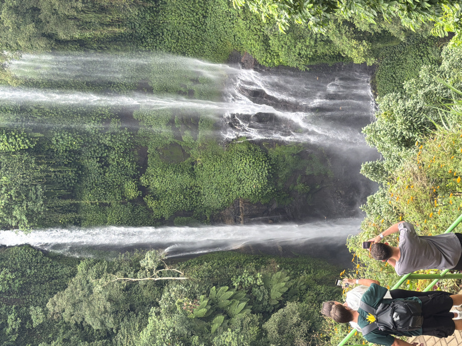A tall, multi-tiered waterfall surrounded by lush, green vegetation cascades down a rocky cliff face. A group of tourists stand on a paved viewing platform with a metal railing, capturing the scene with their mobile phones. One person wears a backpack with a bright yellow flower attached. The surrounding landscape is verdant, with trees and shrubs adding to the natural beauty of the location.