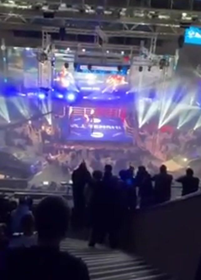 boxing match in a large arena, filmed from an elevated position in the stands. A crowd is gathered, watching the fight in the ring below. The ring is brightly lit with spotlights, and large screens above show the fighters and fight information. Spectators are cheering and there is audible crowd noise. The person filming is in a darker area of the stands, with other spectators around them.