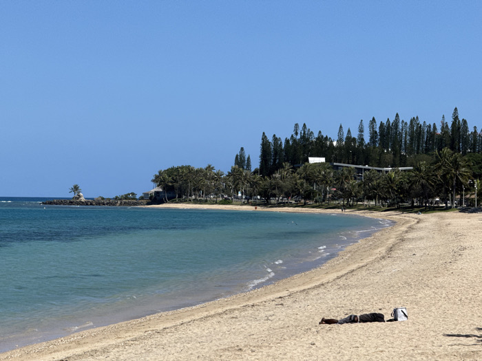 The image depicts a wide, curved sandy beach on a clear, sunny day in Noumea, New Caledonia, France, specifically identifiable as Anse Vata Beach due to the distinctive features