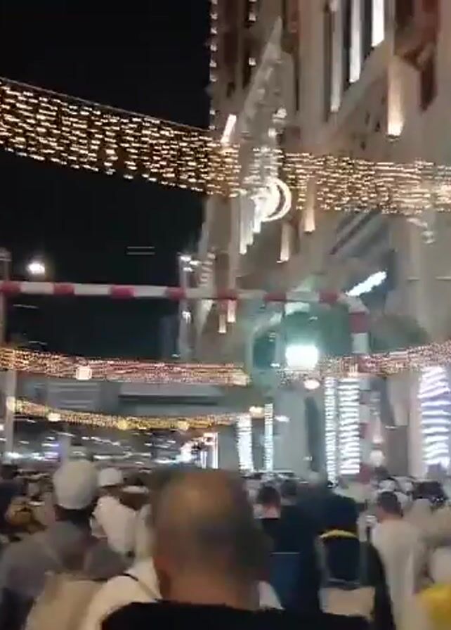 A dense crowd of people moves down a street at night, under bright rows of festive lights hung overhead. The lights are arranged in parallel lines across the street, and some include crescent moon symbols. The buildings lining the street are brightly lit and have a distinctive architectural style. A metal structure with red and white striped poles spans the street. Many people are wearing white caps. Some individuals are wearing yellow or green sashes. The scene has a festive and crowded atmosphere.