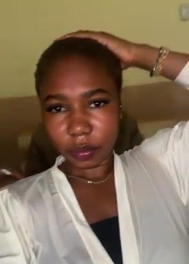 A person with dark skin and light brown hair is in a video. They have a nose ring, a silver necklace, and are wearing a white robe with a black top underneath. The person smiles and makes a hand gesture. They then put their hand under their chin and puckers their lips towards the camera. The background appears to be indoors, possibly a room with light colored walls.