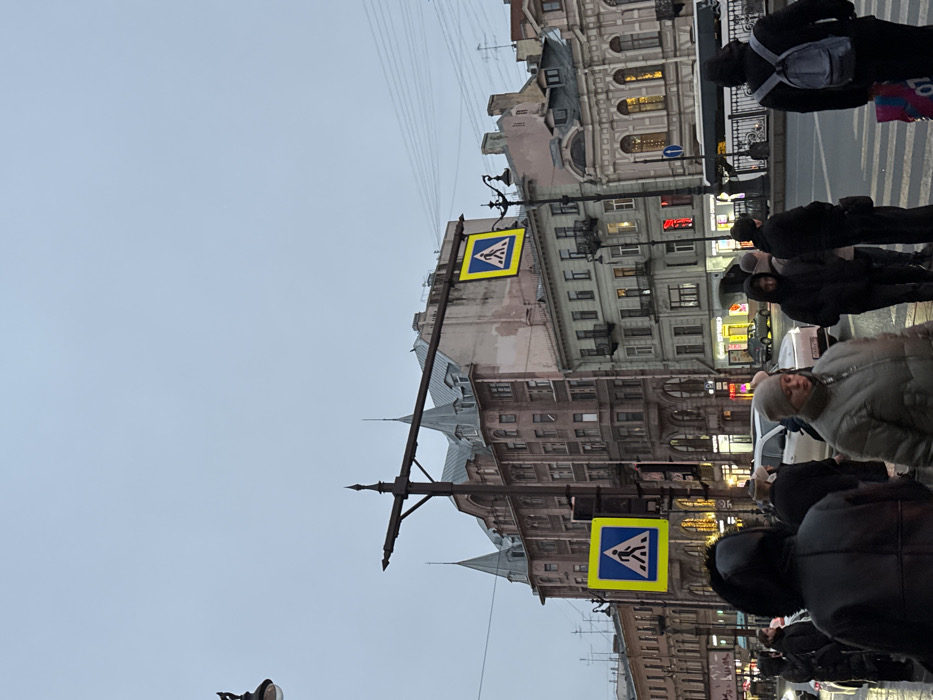 A street scene shows people walking across a crosswalk marked by pedestrian crossing signs, one near the bottom and another higher up on a pole. Buildings in the background are multi-story, with detailed architectural features and lit windows. The sky is overcast, and overhead wires are visible. The image is oriented vertically.