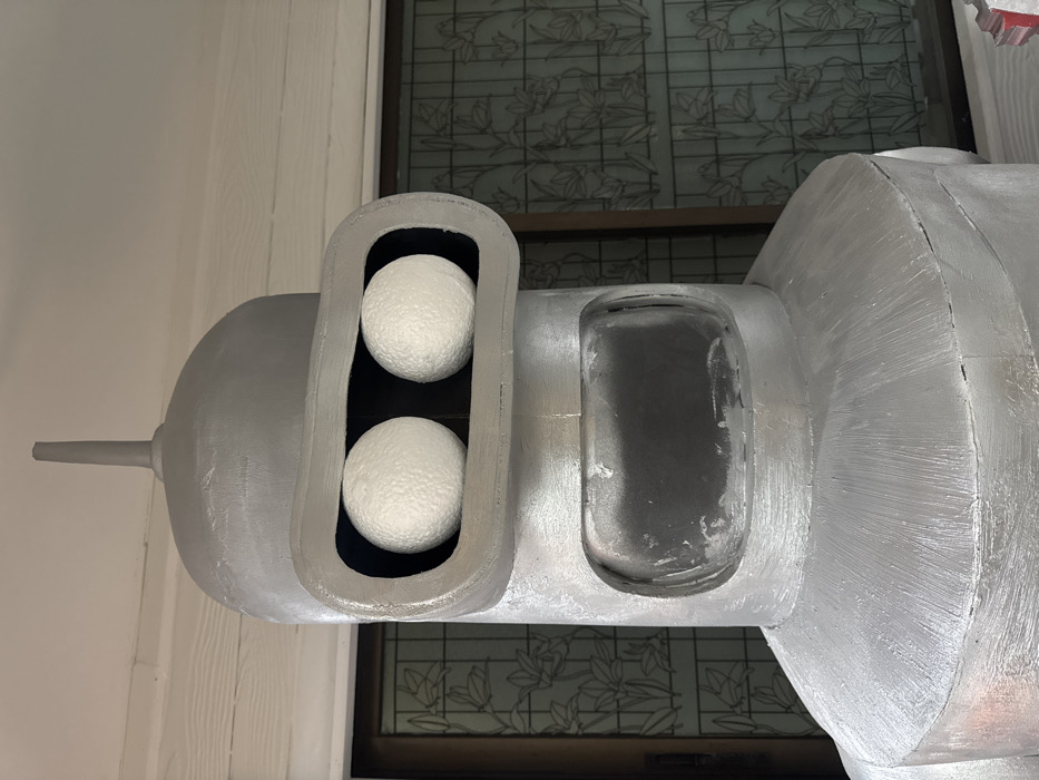A close-up shot presents a silver-painted object, possibly crafted from foam. It features two white styrofoam balls encased within a U-shaped housing. Adjacent to this is a rectangular opening with a translucent covering, likely plastic. A small, pointed protrusion extends from one end. The object is set against a background that includes a window with a patterned design and a section of a white wall. The overall texture of the object suggests a handmade, slightly rough finish.