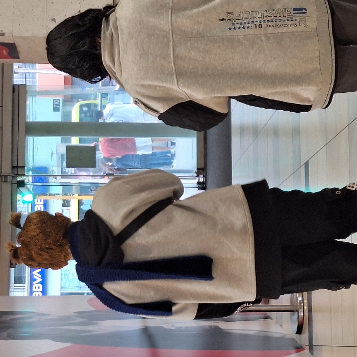 Two people stand inside what appears to be a shopping center. One person wears a light-colored jacket with “SPORTSWEAR” printed on the back and dark pants. The second person wears a light-colored jacket with a black strap across their body, black pants, and a dark blue scarf around their neck. A BBVA sign is visible in the background. The area is bright and well-lit.