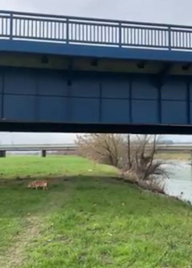 view under a blue bridge. In the foreground is a grassy area leading to a riverbank. A tan-colored dog is walking on the grass. In the background, another bridge is visible over a field. The sky is overcast.