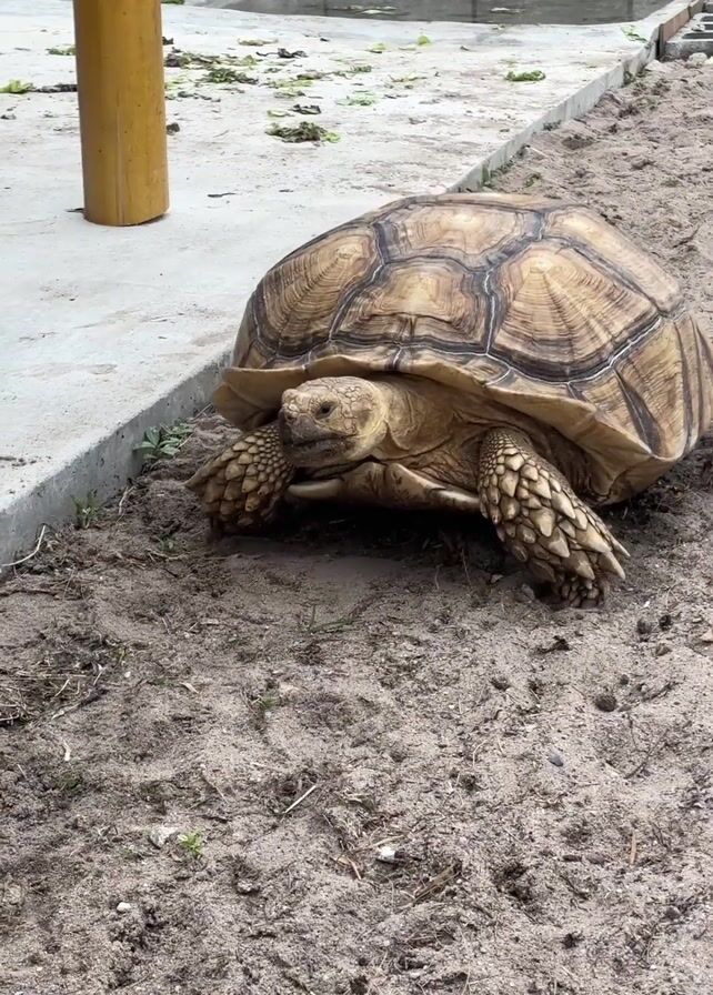 large tortoise in a sandy enclosure