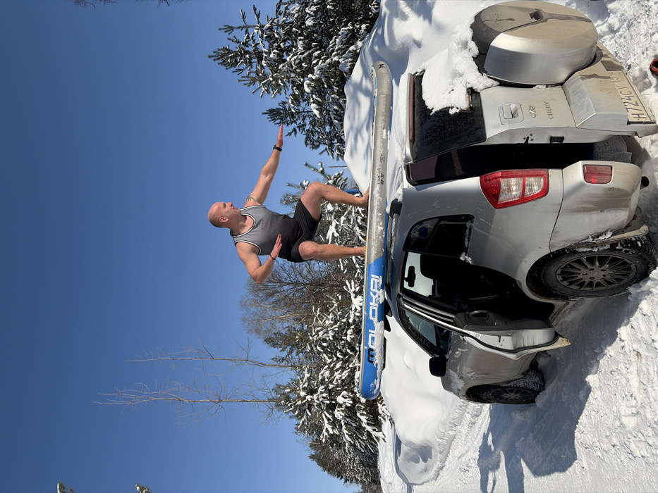 The scene depicts a snowy, forested environment identified as Noviy, Russia, on a clear, sunny day. A bald adult male, dressed in a grey and black sleeveless top and black shorts, stands barefoot atop a blue and white 'MOLOKAI LIGHTAIR' inflatable stand-up paddleboard. The paddleboard is secured to the roof rack of a silver Chery Tiggo SUV, which is parked on a snow-covered track. The man is positioned in a squatting stance with arms extended, mimicking a surfing action. The SUV's rear driver-side door is open, and its rear features a mounted spare tire and a visible Russian license plate 'H 724 CY 199 RUS'. The background consists of numerous snow-covered evergreen trees and bare deciduous trees under a vibrant blue sky.