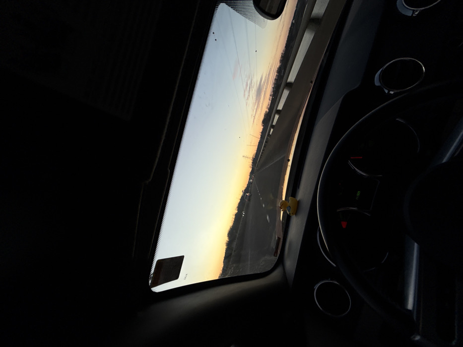 A car's interior view captures a golden sunset visible through the windshield, illuminating a highway. The dashboard and steering wheel dominate the frame, casting dark shadows. A small yellow object is attached to the dashboard, contrasting with the dark interior. Outside, power lines stretch across the sky, hinting at a long road ahead.