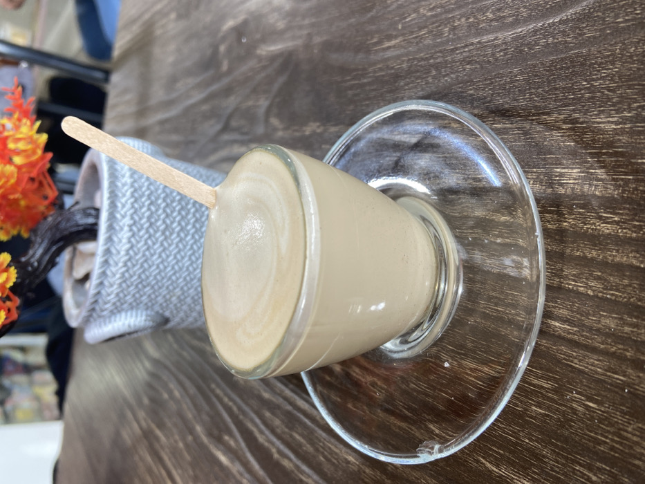 A small glass cup containing a light brown, frothy beverage, likely a coffee drink, is centered on a clear glass saucer