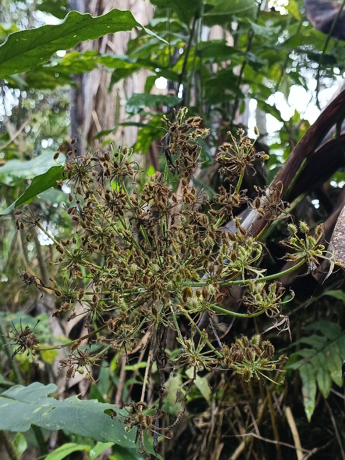 A close-up captures a cluster of seed heads, likely from a plant in the parsley family. The heads are a mix of brown and green, with tiny seedpods covered in small prickles. They grow from thin, wiry stems branching out from a central point. The background is blurred, suggesting a forest or jungle setting with lush foliage, including large green leaves and ferns.