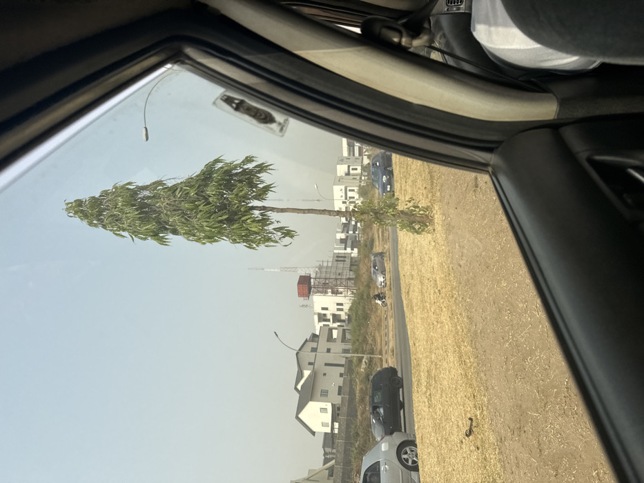 This image depicts an urban roadside scene in Aso, Nigeria, viewed from the passenger side of a vehicle. The foreground features the vehicle's dark gray interior trim and a partially visible occupant wearing a white shirt on the right. A tall, slender tree with dense green, tapering foliage stands prominently in the mid-ground, accompanied by smaller plant growth at its base. Behind the tree, a paved multi-lane road extends horizontally. Vehicular traffic on the road includes a silver sedan, a black SUV, a motorcycle with a single rider, a light-colored sedan, and a dark-colored sedan. The ground adjacent to the road is dry, covered in sparse, yellowish-brown vegetation. A street light with a curved pole is visible behind the tree. In the background, a cluster of modern, white multi-story buildings is visible, some of which appear to be under construction with scaffolding. A red cylindrical water tank on a white support tower is situated among these structures, with a lattice communication tower visible further in the distance. The sky is a pale, hazy blue.