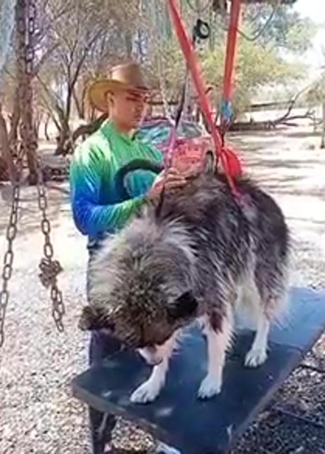 man grooming a large dog outdoors. The man wears a cowboy hat and a colorful long-sleeved shirt. He is standing next to a metal table on which the dog is standing. The dog, appearing to be a husky mix, is gray and white. The dog is wet, and restrained by red straps suspended from above. The man holds a dog dryer and uses it to blow-dry the dog's head. The setting appears to be a rural area with trees and gravel on the ground. A red car is visible in the background.