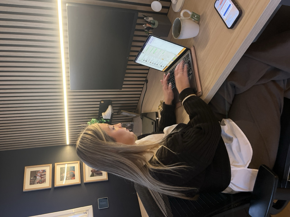 An indoor scene in Rueil-Malmaison, France, depicts a female subject seated at a light wood-grain desk, actively typing on a silver laptop