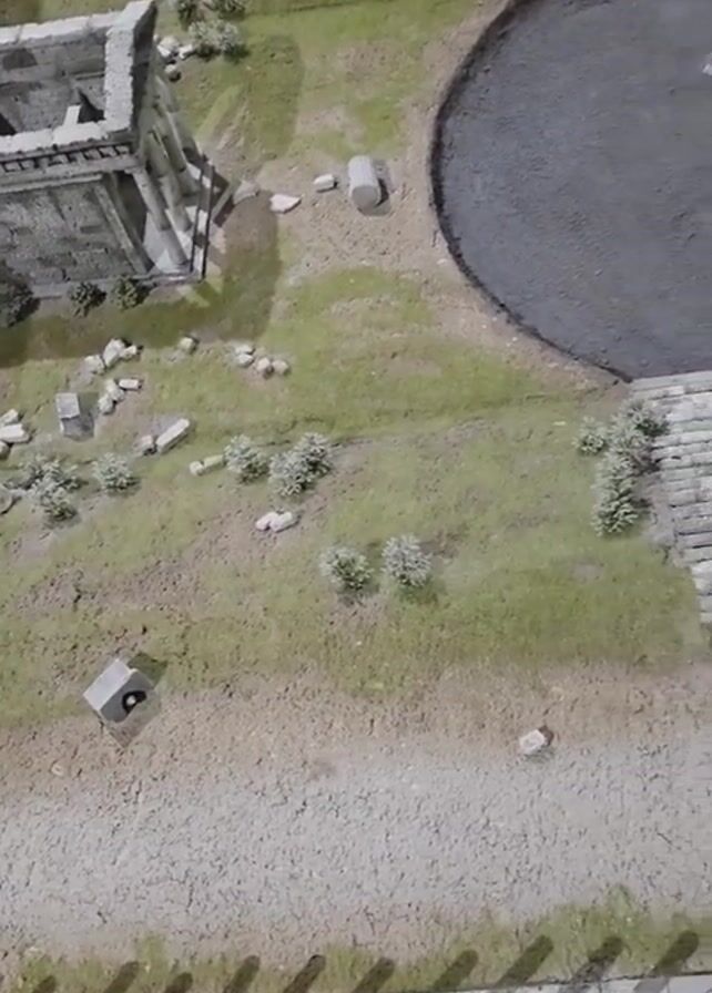 The camera, positioned overhead, pans across a detailed diorama representing an ancient Roman or Greek setting. The diorama features architectural ruins, including a corner of a building and a section of a stadium with tiered seating. The stadium surrounds an oval-shaped arena, filled with a dark, possibly wet material, with a few fragmented architectural elements scattered within. The landscape consists of grassy areas, dirt paths, and rocky terrain, dotted with small bushes and fallen pieces of stone. The overall impression is of a miniature recreation of an archaeological site.