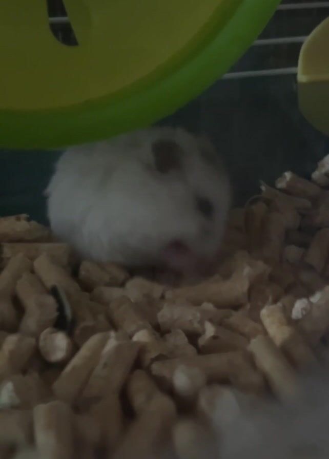 small, white hamster with brown markings on its head sitting amongst wood pellet bedding inside its cage. Above the hamster is a green and yellow exercise wheel. The hamster is chewing or grooming itself. The cage is in a dimly lit environment.