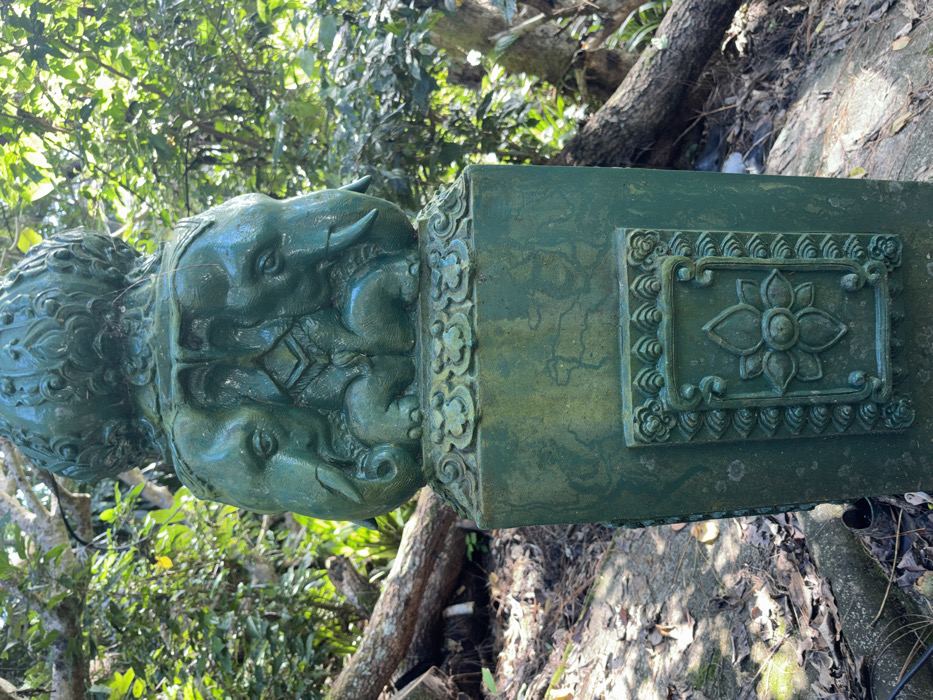 A green stone structure with intricate carvings rests on the ground amidst a wooded area. The top features four sculpted elephant heads facing outward, crowned with decorative foliage. Below this, the pillar is adorned with a square panel containing a stylized lotus flower design. The background consists of lush greenery and trees, suggesting an outdoor, natural setting. The pillar's texture and color suggest age and weathering.