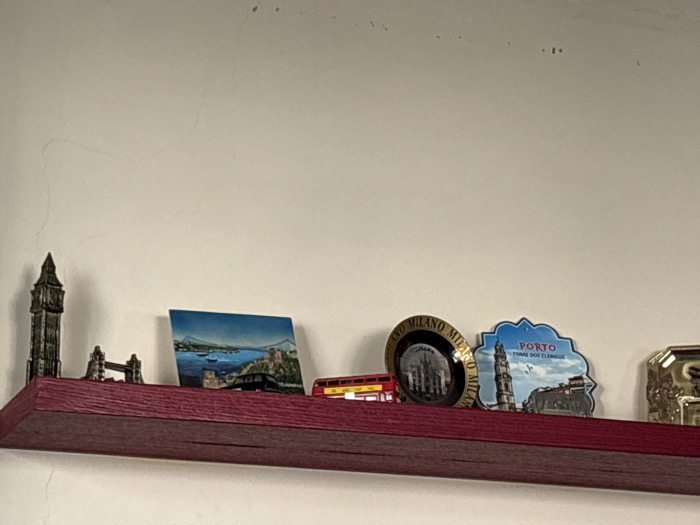 The image displays a section of a white interior wall with a dark red wooden shelf affixed horizontally across its lower third. The wall exhibits faint hairline cracks and minor surface imperfections. Positioned on the shelf, from left to right, are a series of ornamental objects. These include a dark miniature replica of a clock tower, a smaller dark miniature bridge structure, a rectangular print depicting a coastal landscape with a body of water, boats, and a bridge, and a miniature red double-decker bus. Further to the right are a circular souvenir plate with "MILANO" inscribed on its rim and an image of a prominent building, and an irregularly shaped blue-edged souvenir plaque labeled "PORTO TORRE DOS CLERIGOS" featuring an image of the Clerigos Tower. A partially visible ornate gold-colored metallic box is situated at the far right. No individuals, actions, or interactions are present. The image contains no visual information to determine its location within As-Salihiya Municipality, Syria.