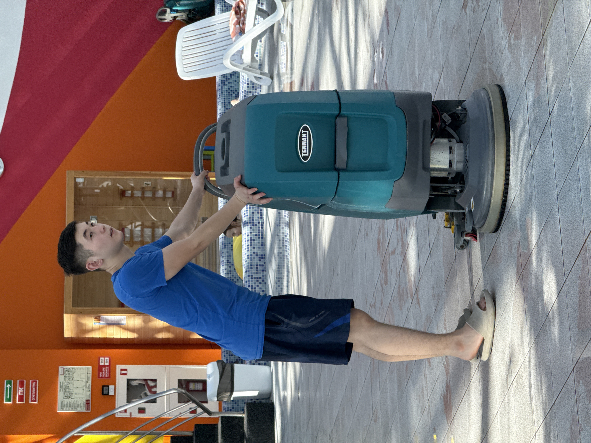 A young man is operating a Tennant brand floor scrubber on a tiled floor