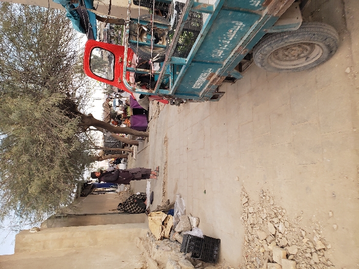 The image depicts an outdoor street scene in Kandahar, Afghanistan. In the foreground right, a partial view of a blue three-wheeled cargo vehicle, featuring a red driver's cabin, is present. Its cargo bed contains items, including what appears to be green leafy produce in black crates, and a tire. Arabic/Dari script, including a phone number "0789708038...", is visible on the vehicle's side. The ground in the foreground left consists of dirt and scattered light-colored rubble, alongside two black plastic crates. A paved walkway extends from the midground into the background. To the left of this walkway, a rough, light-tan colored wall runs parallel to the path. An individual is seated on the ground against this wall in the midground left, partially obscured by a plaid blanket or shawl. Standing on the paved walkway, slightly left of center, is an adult male dressed in a dark jacket over light-colored trousers and sandals. He faces slightly right with his hands clasped. Further down the street, several deciduous trees with sparse foliage line the right side of the walkway. Beneath these trees, multiple market stalls are visible. One prominent stall features a purple fabric display surface holding various fruits, including pomegranates. The background reveals an active street scene with additional vehicles and people under a light sky.