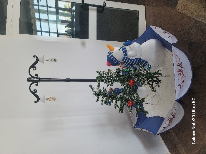 An indoor scene in what appears to be a public waiting area or lobby features a festive corner decoration. Centrally positioned is a black, ornate lamppost with two upward-curving arms, each holding a small, frosted glass lamp containing a decorative bulb. Below the lamppost, two small artificial Christmas trees, adorned with red baubles and string lights, are arranged within an inverted, partially opened blue and white fabric umbrella acting as a base, decorated with red festive patterns. To the right of the trees stands a white snowman figure, wearing a blue and white striped beanie hat and a matching scarf, with an orange nose. The display rests on a dark brown floor against a plain white wall. To the right, a glass door or window reflects an interior space containing several silhouetted human figures seated. The exact location in Gura Top, Nigeria, is not discernible from the image.