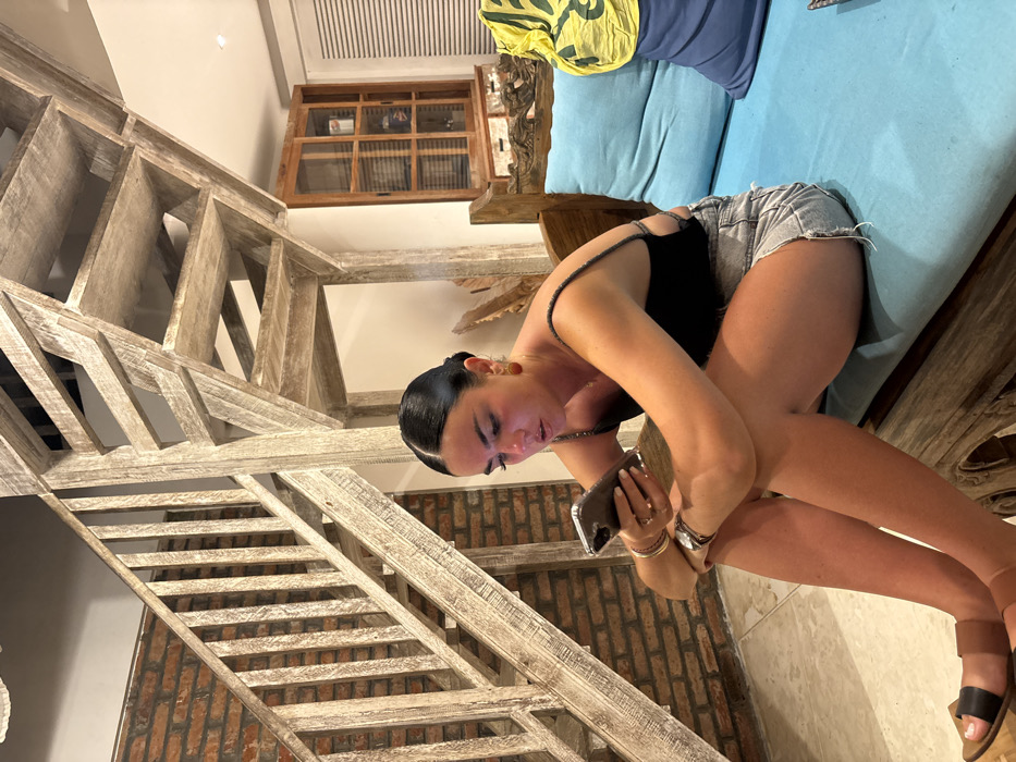 A female individual is seated indoors in Pecatu, Indonesia, on a light blue cushioned wooden bench. She is observed looking down at and interacting with a silver-colored smartphone, held with both hands, its illuminated screen casting a pinkish glow onto her face. The subject wears a black spaghetti strap top, light-wash distressed denim shorts, and brown and black flat sandals. Her dark hair is pulled back, and she has visible red-orange drop earrings, a watch on her left wrist, multiple bracelets, and a ring on her right hand. Behind her, a prominent rustic-style light-colored wooden staircase with visible balusters and risers ascends towards the upper left. A section of exposed light-toned brick wall is visible behind the left portion of the staircase. To the right of the staircase, a wooden cabinet with glass-paned doors and drawers is present. A dark blue pillow and a yellow and green patterned item are visible on the bench to the subject's right. The indoor lighting suggests an evening or nighttime setting.