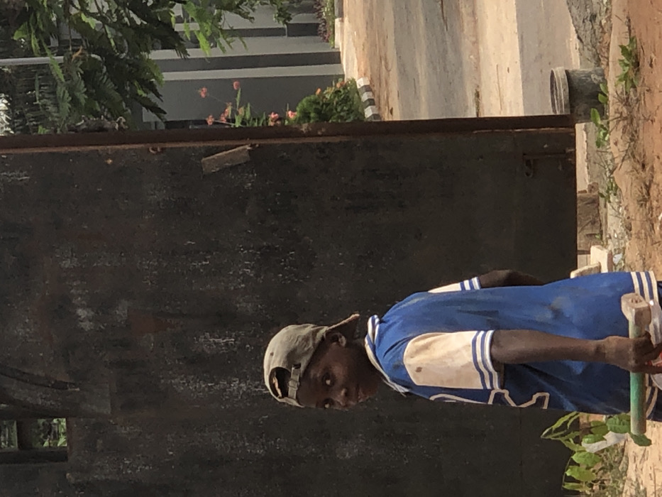 The scene, located in Abatete, Nigeria, depicts a young male subject in the mid-ground, slightly left of center. The individual, appearing to be a child, has dark skin and wears a light brown baseball cap reversed. He is dressed in a blue short-sleeved shirt with white sleeves and blue-and-white striped cuffs and hem, displaying noticeable dirt or smudges on the fabric. The subject is turned partially away but looks over his left shoulder directly at the viewer, exhibiting a slight smile. He holds a green-handled tool, possibly a trowel, in his right hand, which hangs at his side. The foreground consists of reddish-brown dirt. Behind the subject and to his left stands a large, dark, weathered metal gate or wall. To the right of this gate, an opening reveals a paved area with a black-and-white striped curb. Beyond this, green foliage, including trees and bushes with some orange flowering plants, is visible, along with a portion of a modern building featuring grey walls in the background. A white bucket or container rests on the ground near the bottom right edge of the gate.