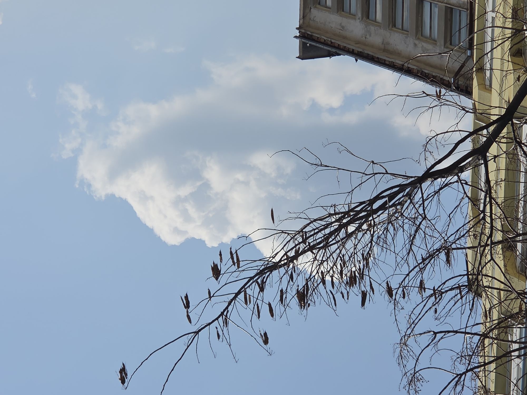 The scene depicts an upward-angled view in Pavlikeni, Bulgaria, dominated by a clear blue sky with scattered white cumulus clouds. In the foreground, a prominent, leafless deciduous tree branch extends from the left and center, featuring numerous dark brown, elongated seed pods hanging from its bare twigs. To the immediate left, a portion of a multi-story building with a light yellow/cream facade is visible, displaying multiple windows with white frames. Below and to the right of this, another older, multi-story building is partially visible, characterized by a faded, rough light grey or off-white exterior and a dark, possibly tiled roofline. A dark gutter system is visible along this roofline, which also has some minor debris or damage. Several dark birds, likely pigeons, are perched along the ridge of this lower building's roof. No human subjects, actions, or interactions are present in the frame.